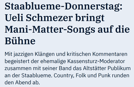 "Wenn Berndeutsch auf Latin-Rhythmen trifft und dem Zündhölzli ein Olé folgt, ist Ueli Schmezers MatterLive-Band nicht weit. Im Luzerner Stadtkeller verpassten sie den zeitlosen Matter-Texten ein massgeschneidertes musikalisches Arrangement. Schmezer sorgte dabei für die nötige Prise Politik."