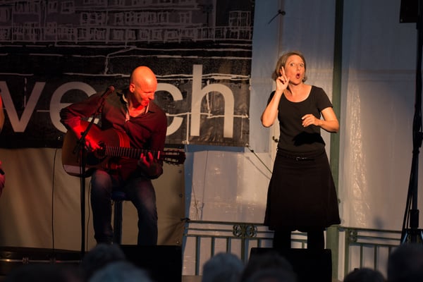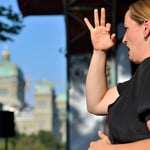 Gebärdensprachdolmetscherin Monika Beyeler, Nick Perrin, Greis, Ueli Schmezer, Michel Poffet, Andi Pupato. Foto: Michael Meier.